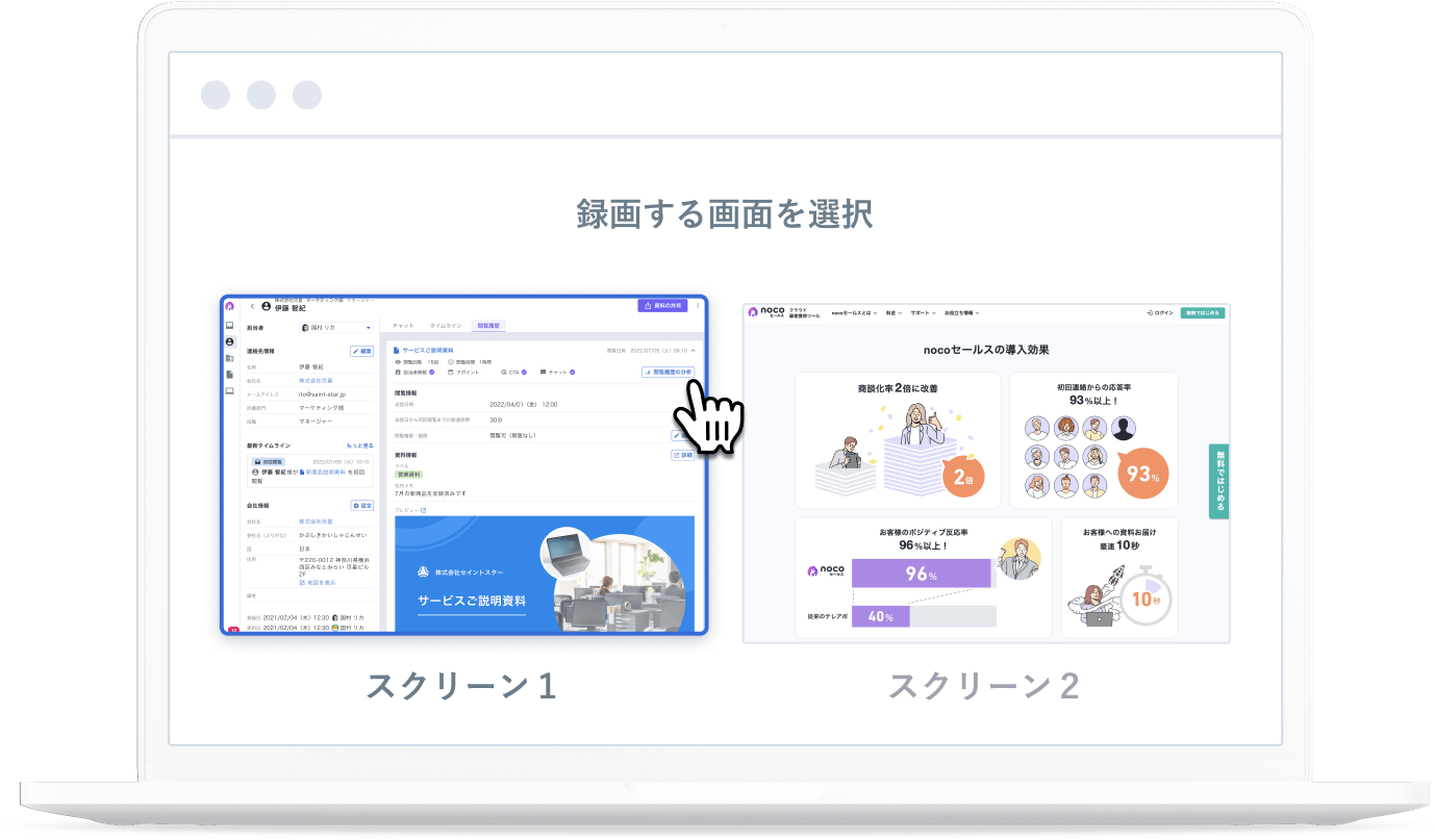 画面全体、 ウィンドウ、またはブラウザのタブのスクリーンをまるごと録画。撮影したビデオクリップはマニュアルやノートに添付できます。社内マニュアルや顧客サポート、eラーニング素材としてご利用いただけます。